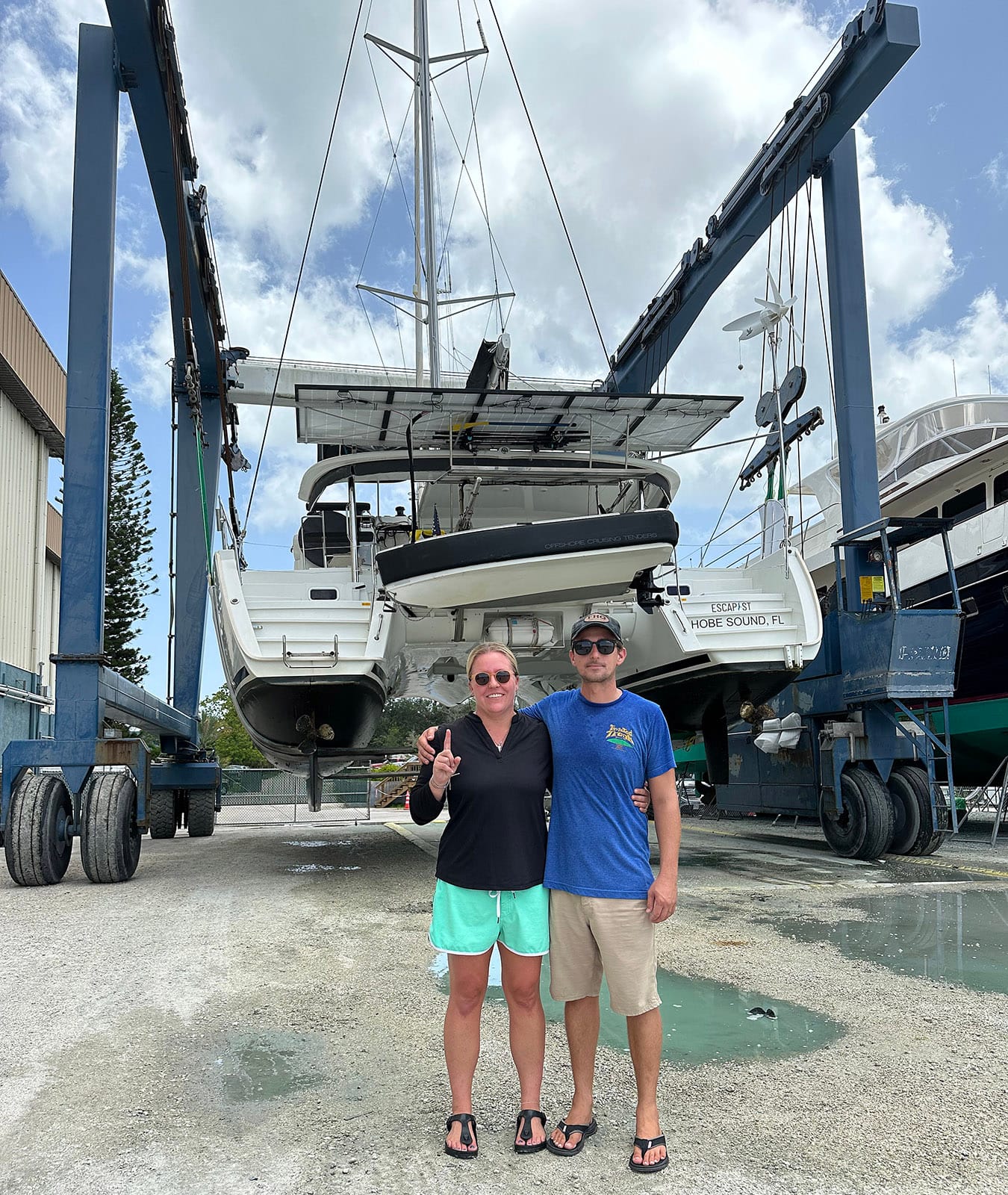 This repair won’t be quick or easy but at least today we made progress. There are still a lot of emotions and unknowns about our future with our boat. But, we will sleep easier knowing she’s safely on the hard and not floating in the intracoastal. On quick inspection, we didn’t see any visual signs of damage to the hull but the thorough inspection next week will be telling.