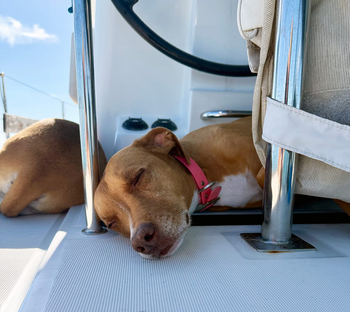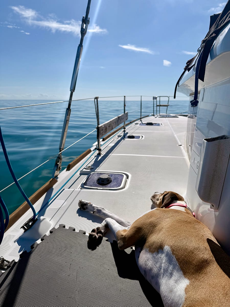 Mooring fields pack a lot of boats in a very small area. There's very little privacy. We can't swim or make our own fresh water. Depending on your mooring assignment, your neighbors can make a big difference. The constant dinghy traffic drives the dogs a bit crazy too. While at anchor, we typically leave the door open so they have free reign of the deck and they love to lay out in the sunshine.