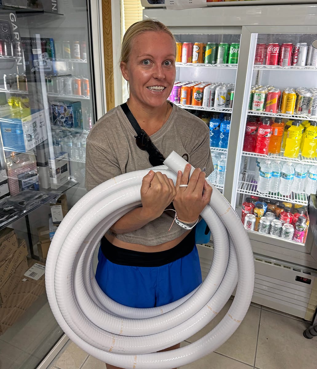 Tom fixed the broken joker valve and spent hours trying to dislodge the clog without any luck. Luckily, we have two heads on the boat to get us by until we could find a solution. The next day, we ran over to the NAPA / General Store to look for replacement hose without any luck.