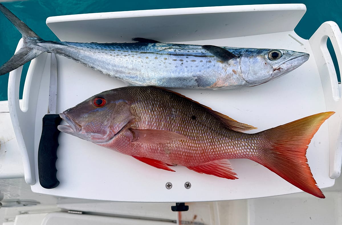 The only bright side was that we finally caught fish! We trolled through the deep water, onto the bank and through the rocky areas. Within the first two hours, we had a mutton snapper and a cero mackerel in the fridge.