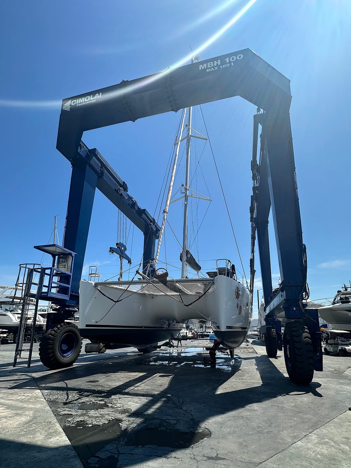 It’s nerve wracking to have a large boat in a tight space. It’s even harder when you have an audience. The current owners of the boat did such a fantastic job maneuvering into the slings that were to hoist us out of the water, with only about a foot of clearance on either side. I hope to someday have that kind of confidence.